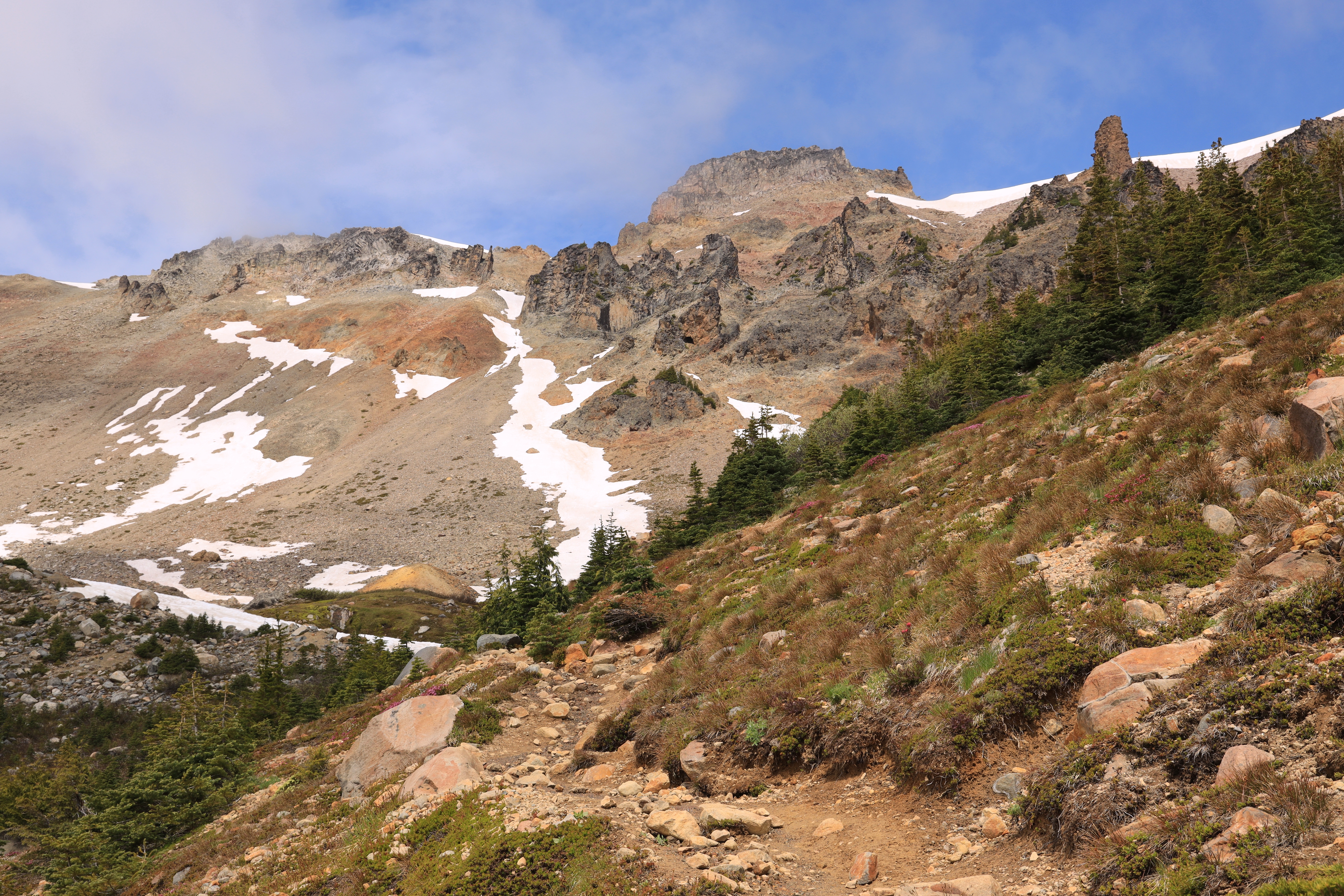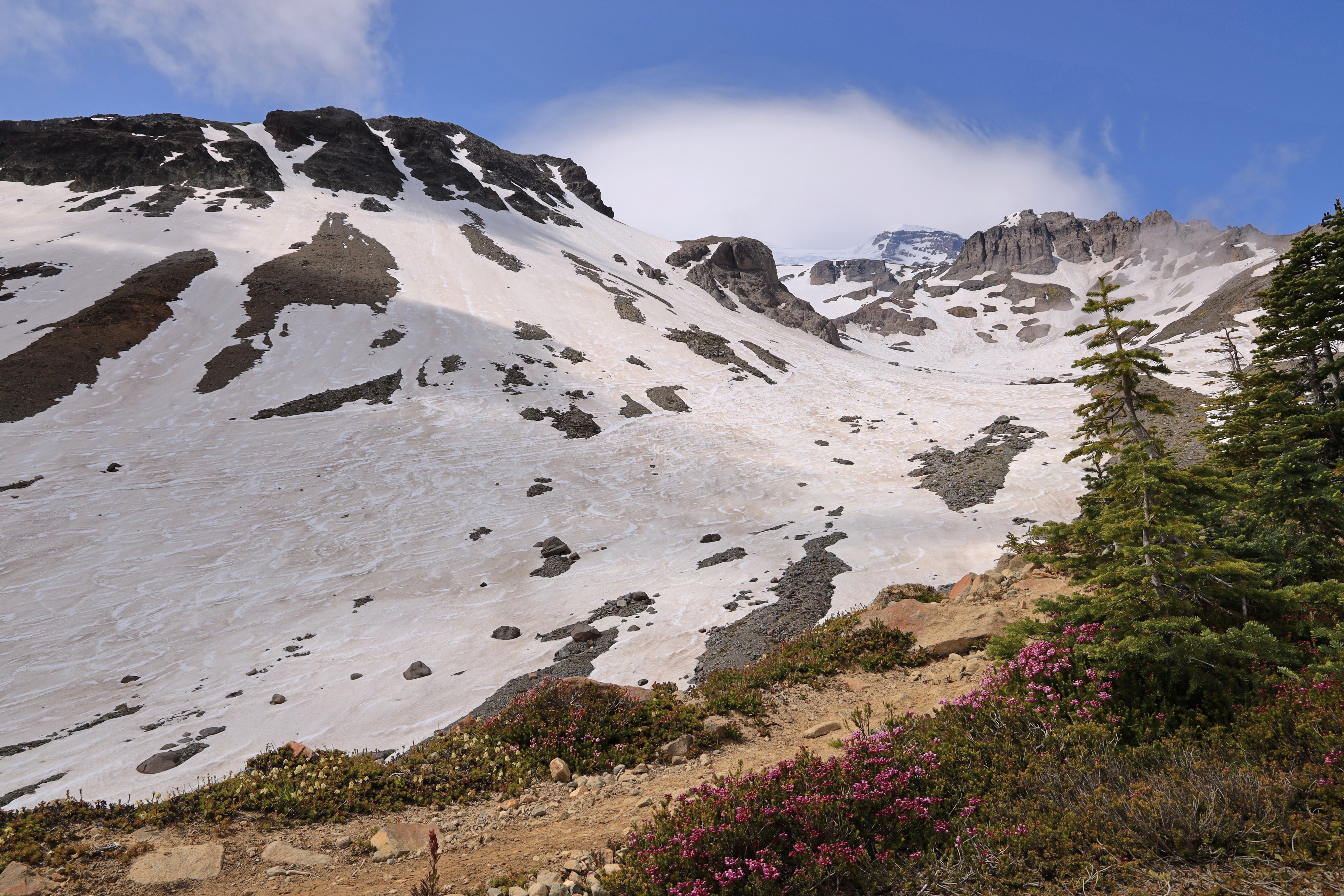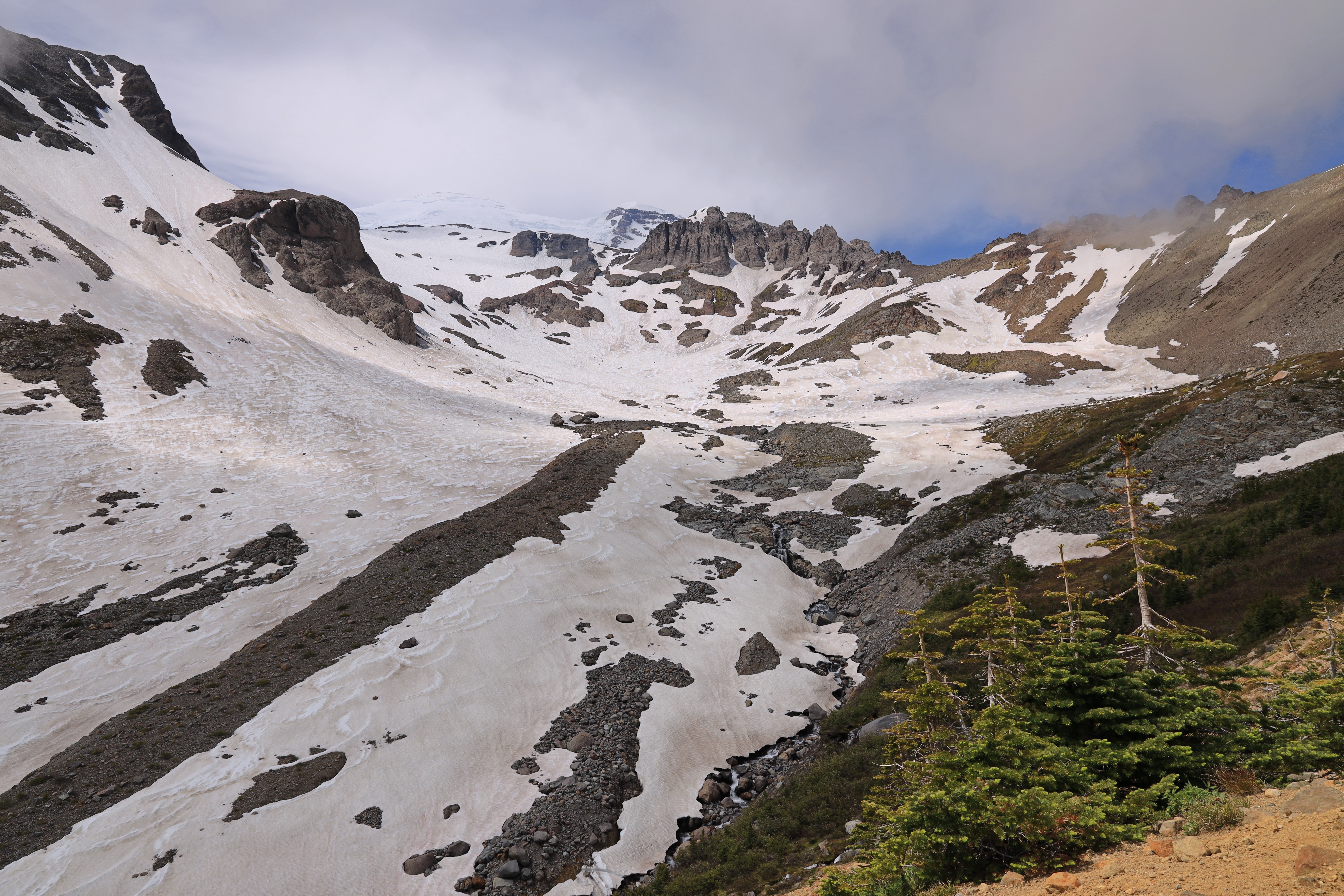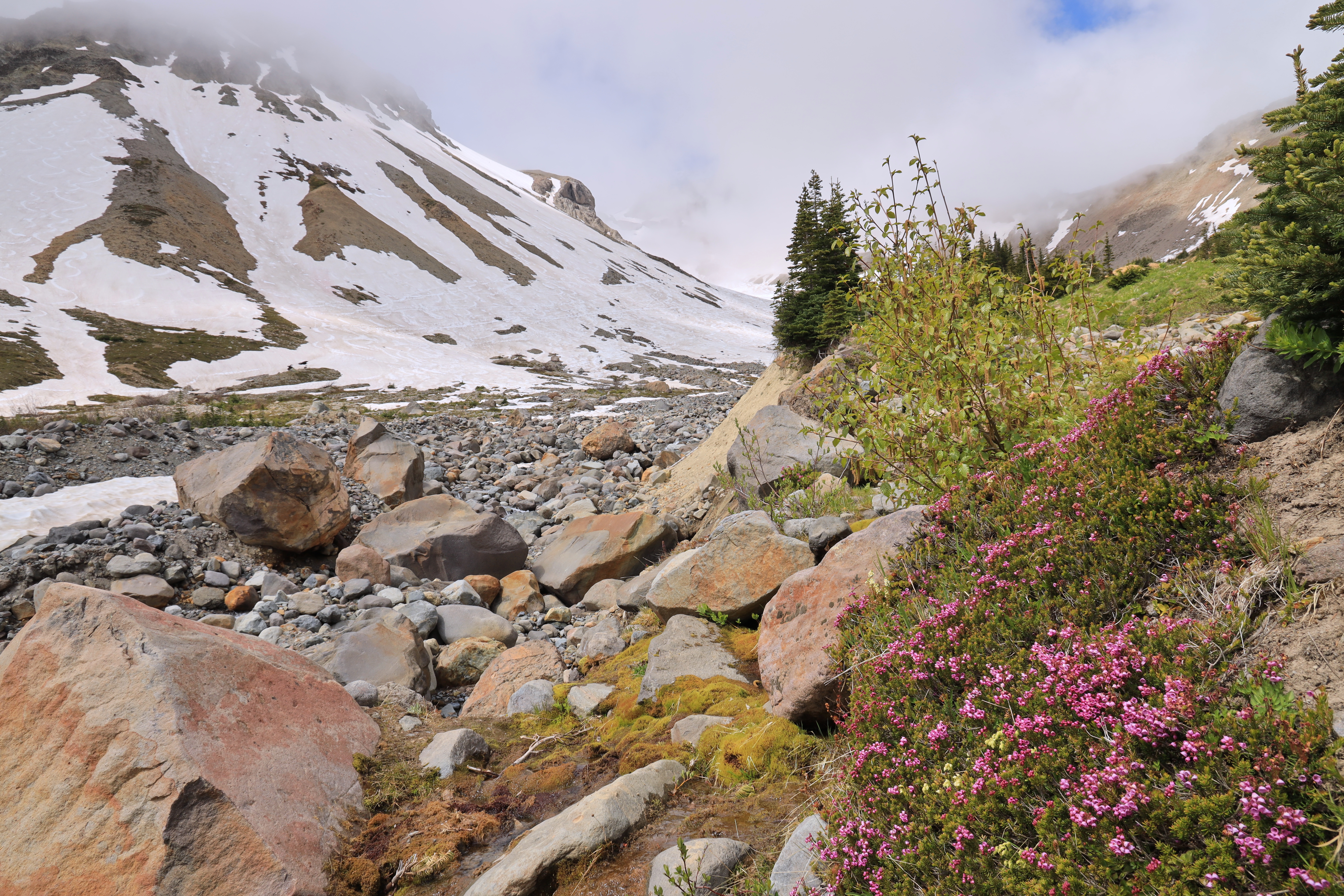 등산로입구에서 2.6마일 지점에 있는 Burroughts Mountain 가는 갈림길입니다. 갈림길 1/4마일 전부터 캠프 (Glacier Basin Camp)까지 잔설구간이 있지만 산행이 많이 불편한 정도는 아닙니다.
