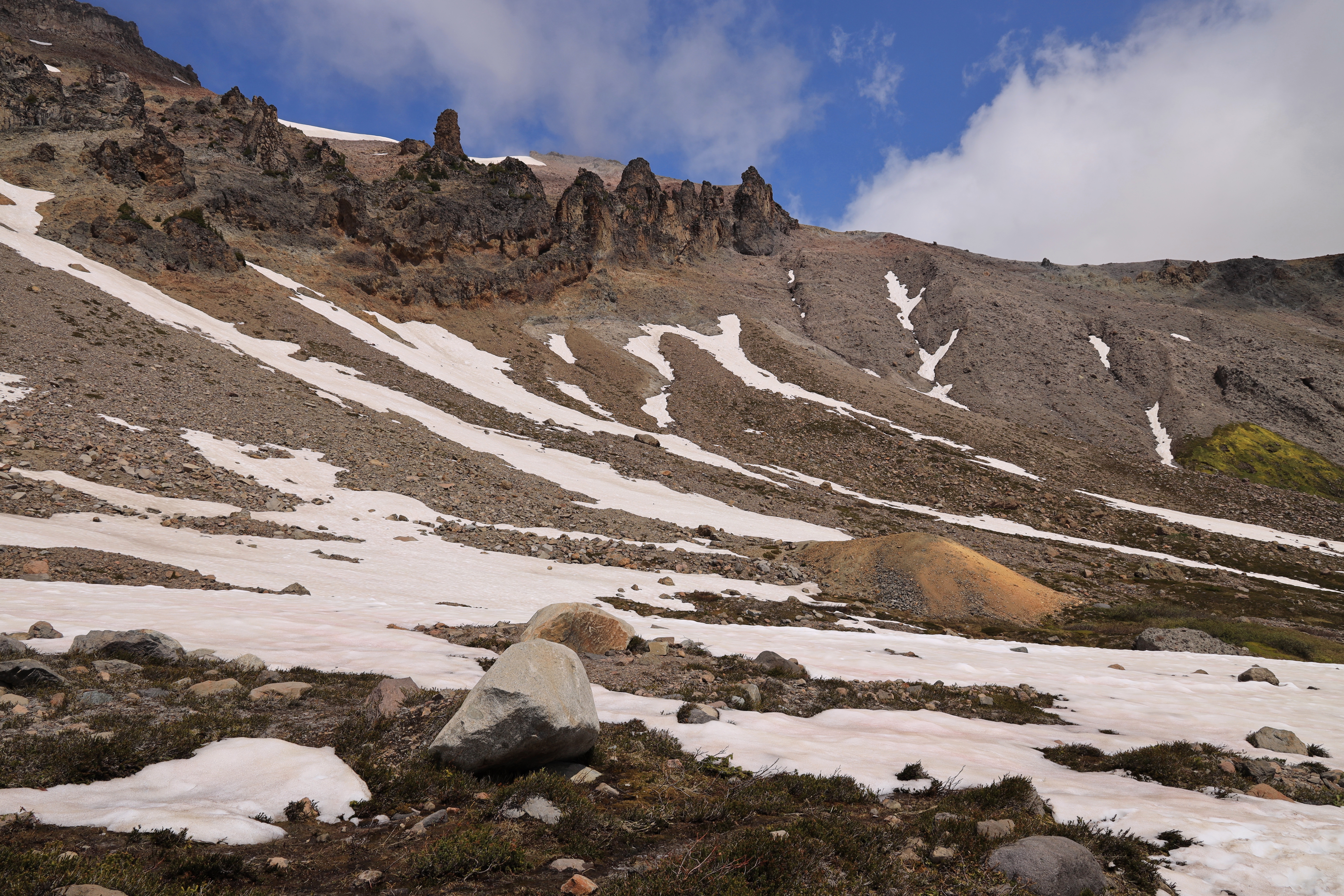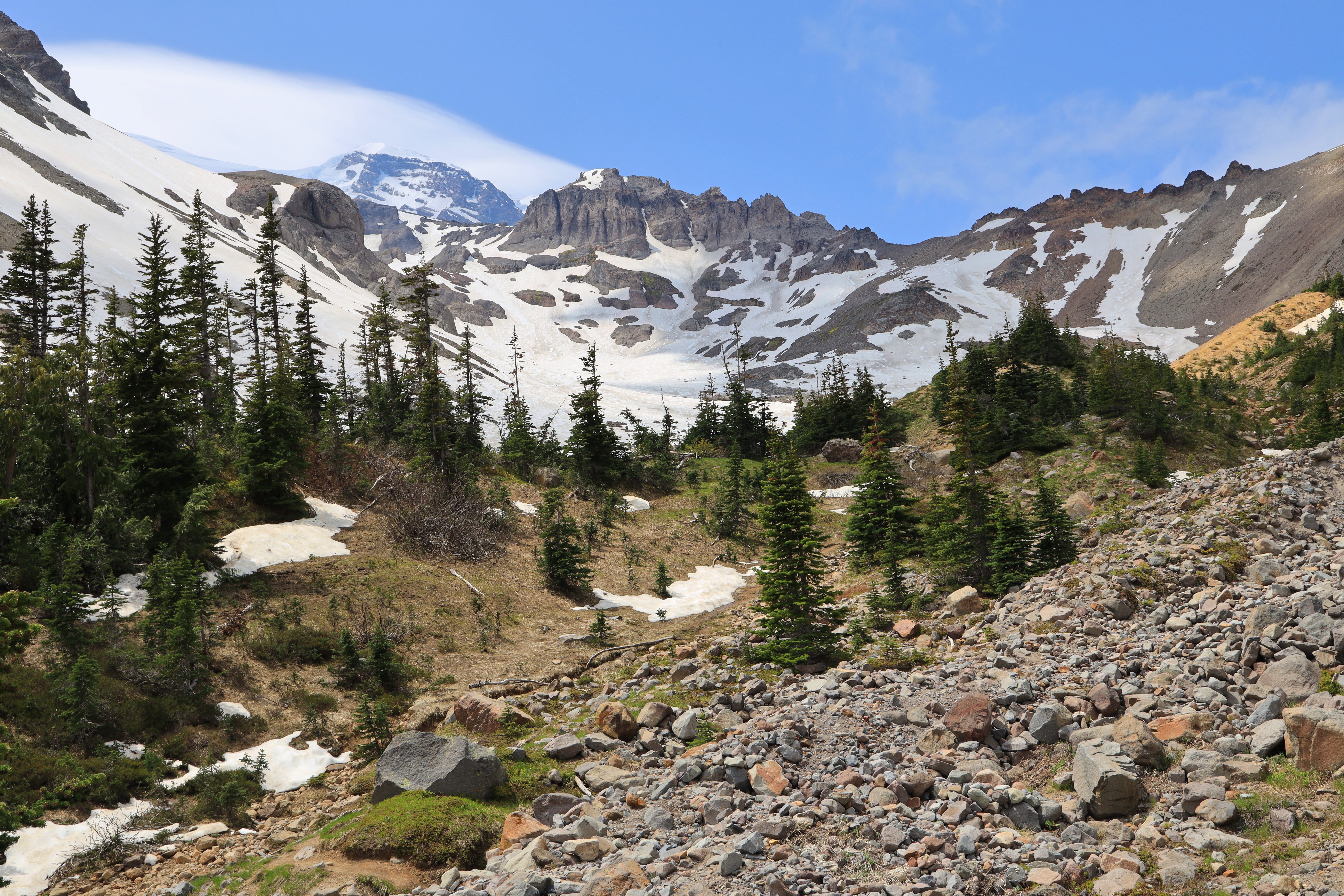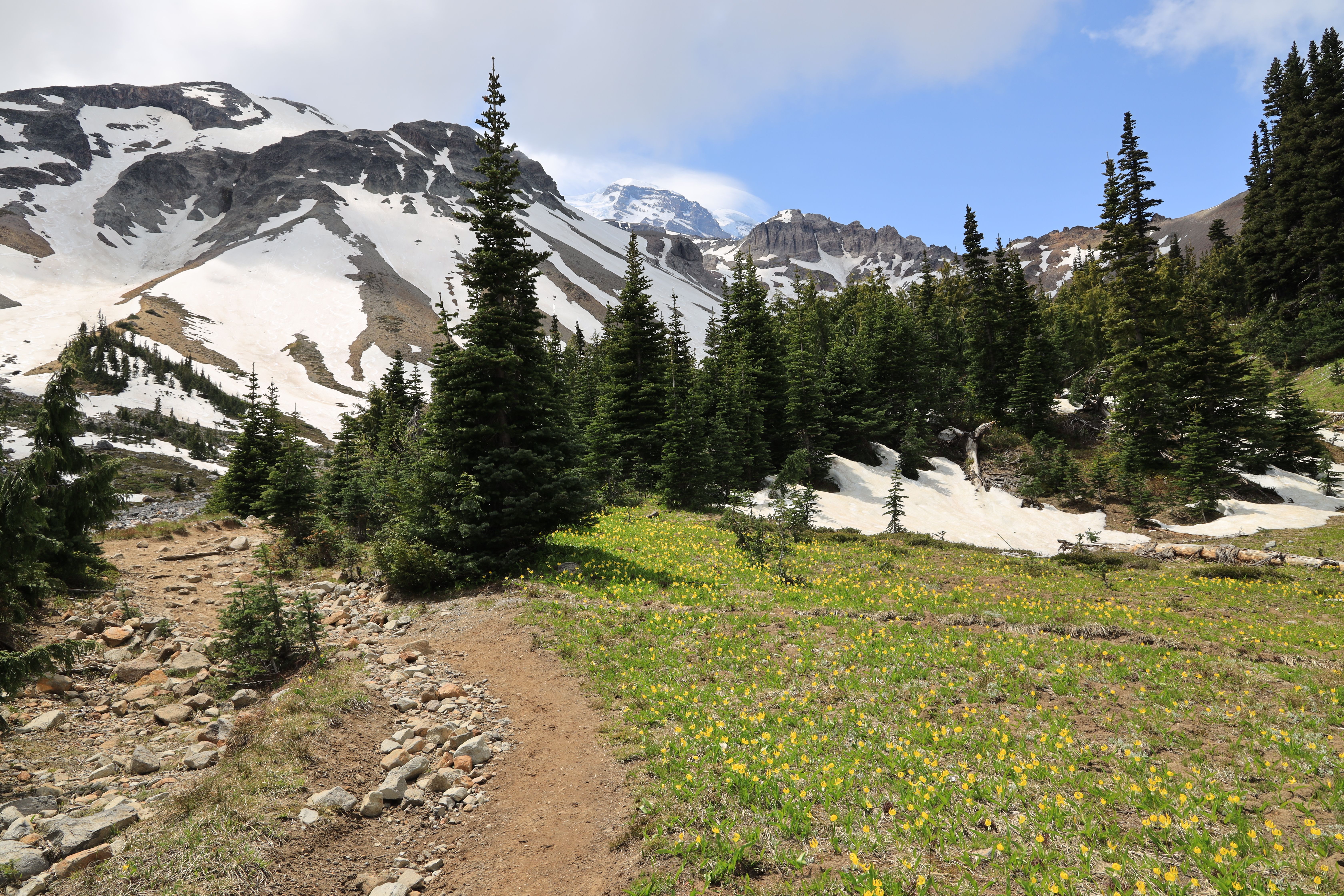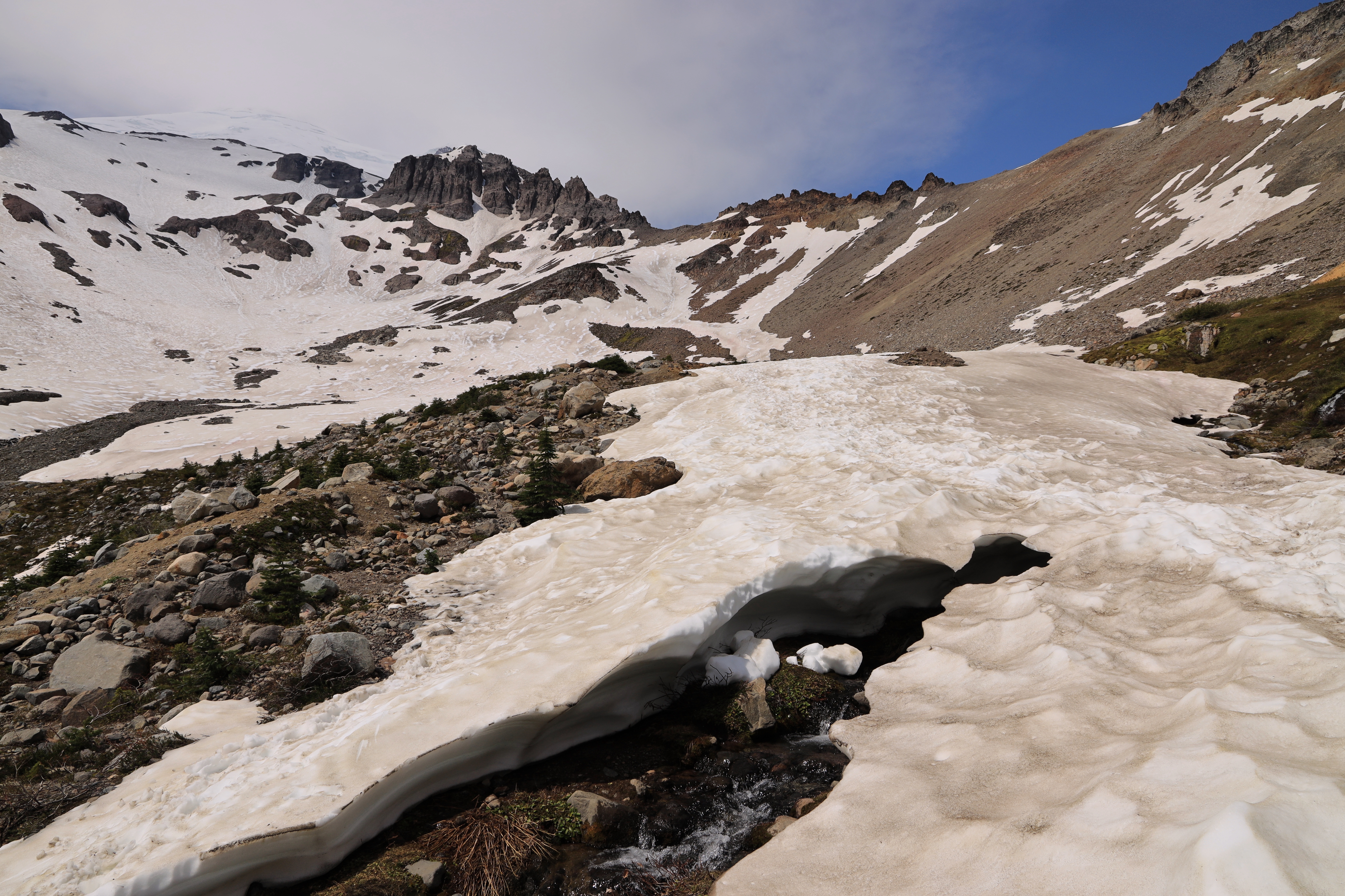 등산로입구에서 2.6마일 지점에 있는 Burroughts Mountain 가는 갈림길입니다. 갈림길 1/4마일 전부터 캠프 (Glacier Basin Camp)까지 잔설구간이 있지만 산행이 많이 불편한 정도는 아닙니다.