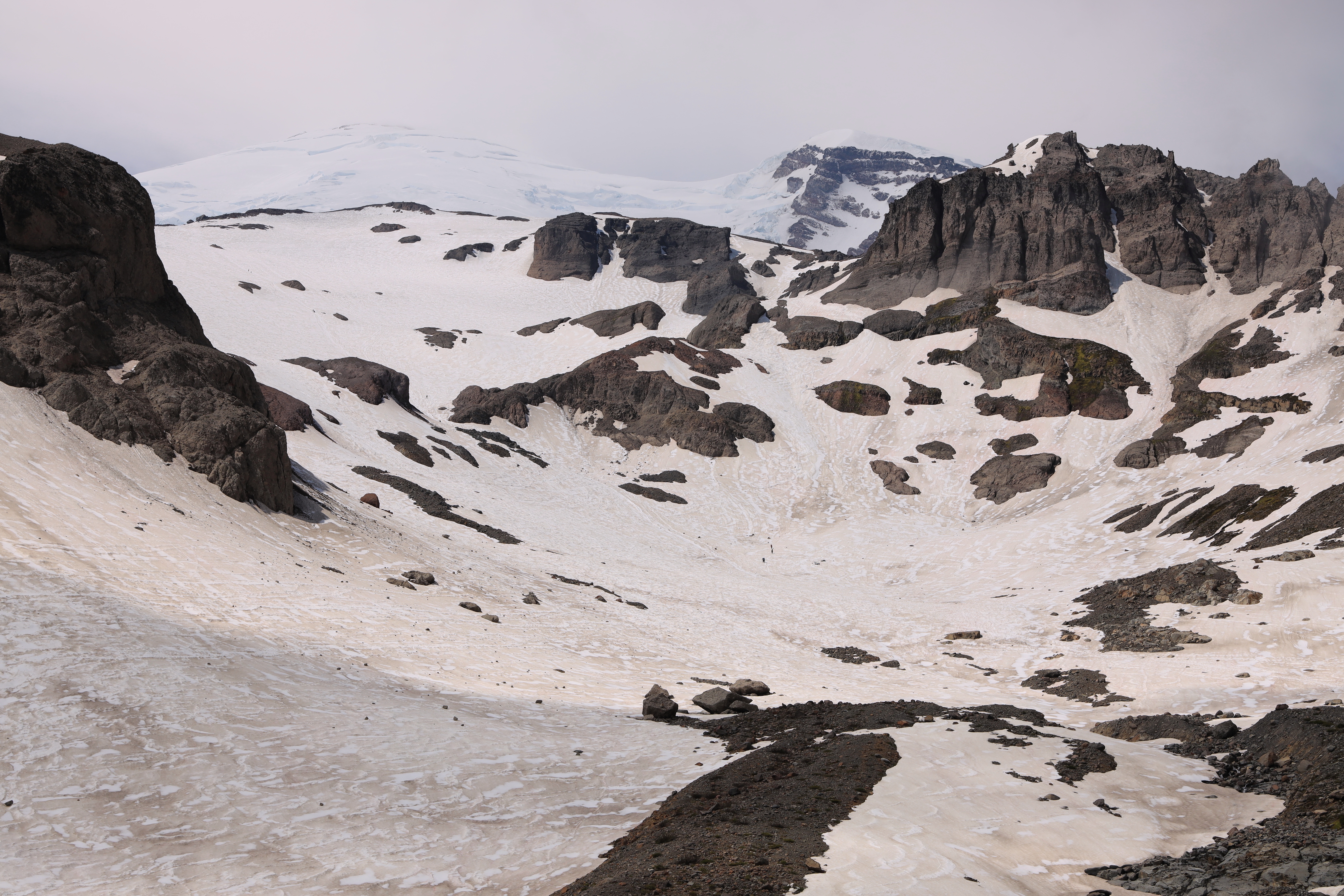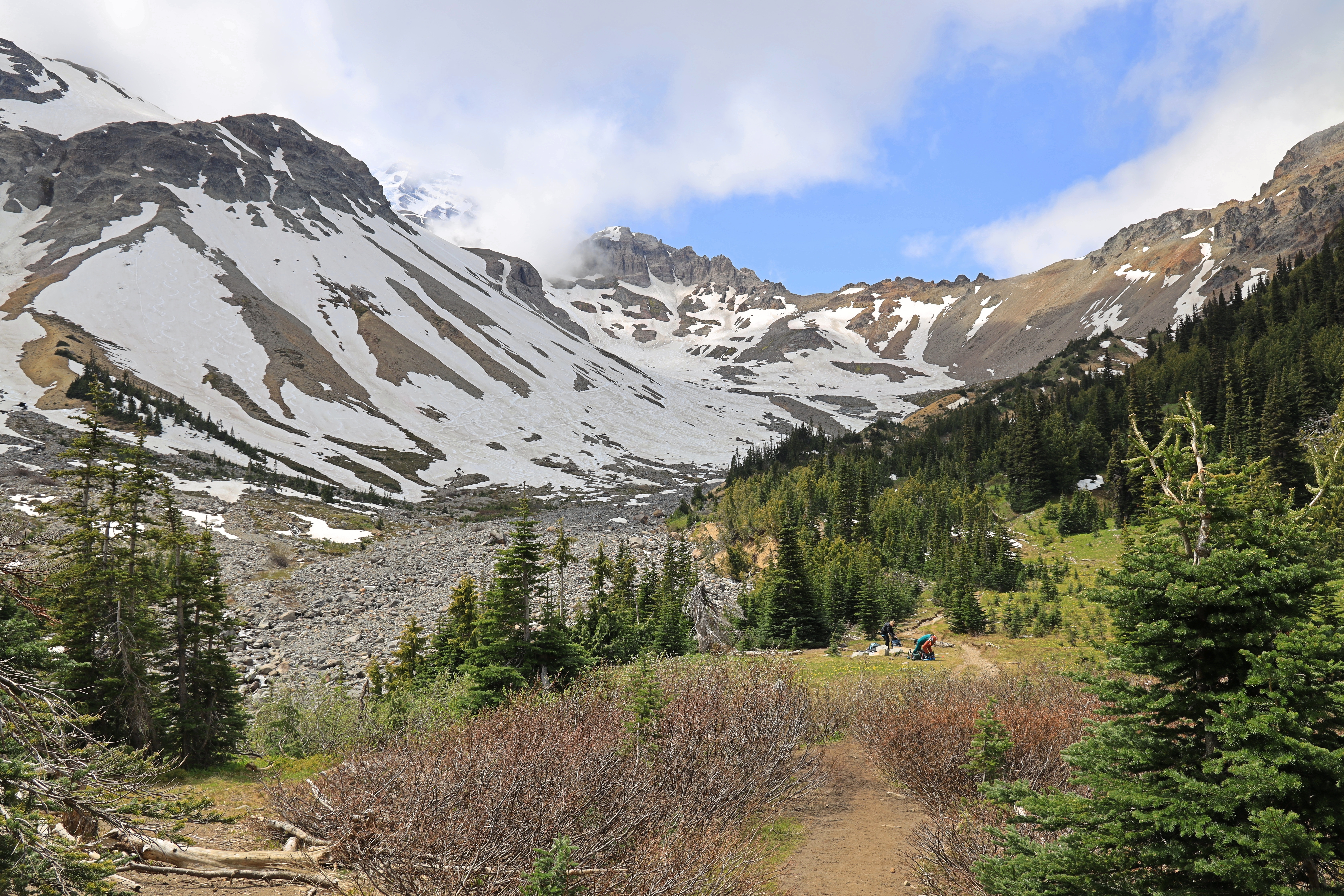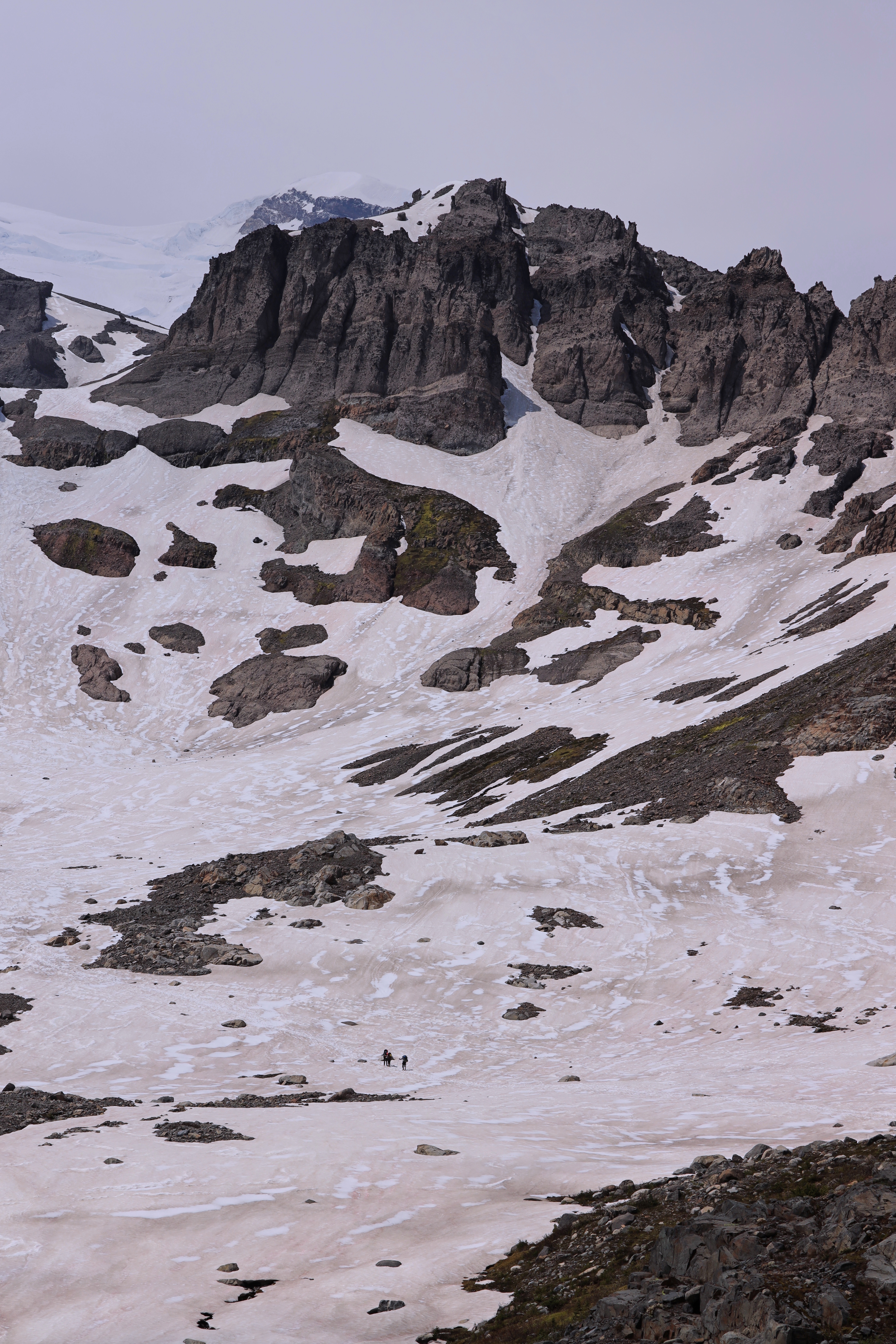 캠프 (Glacier Basin Camp)에서 보는 전경입니다. 앞쪽 등반객은 눈산에 오를 준비를 하고 있습니다. 캠프까지는 등산로 상태가 매우 좋지만, 이 위로는 관리되지 않는 등산로라서 약간 험하고 가파릅니다.