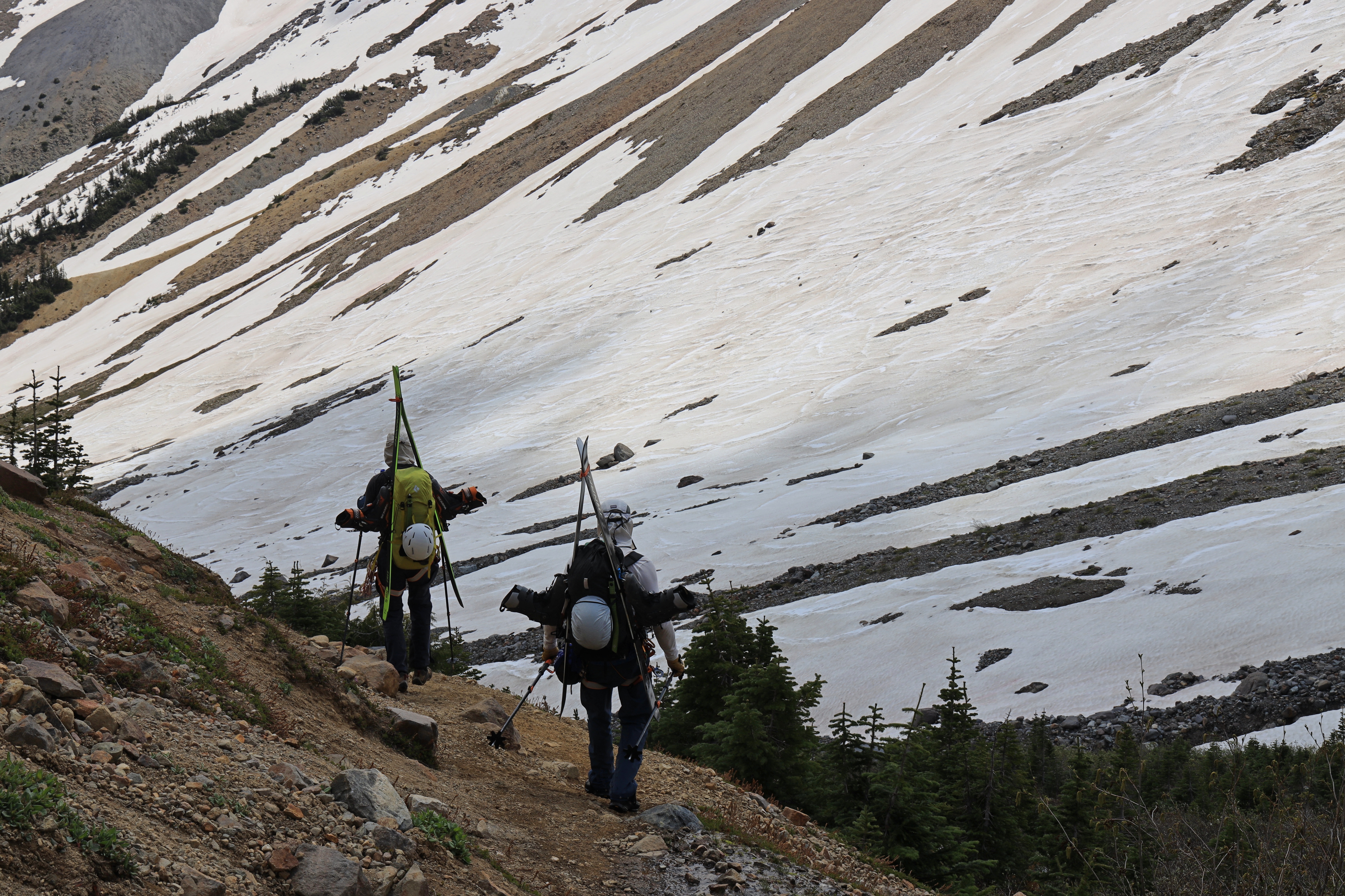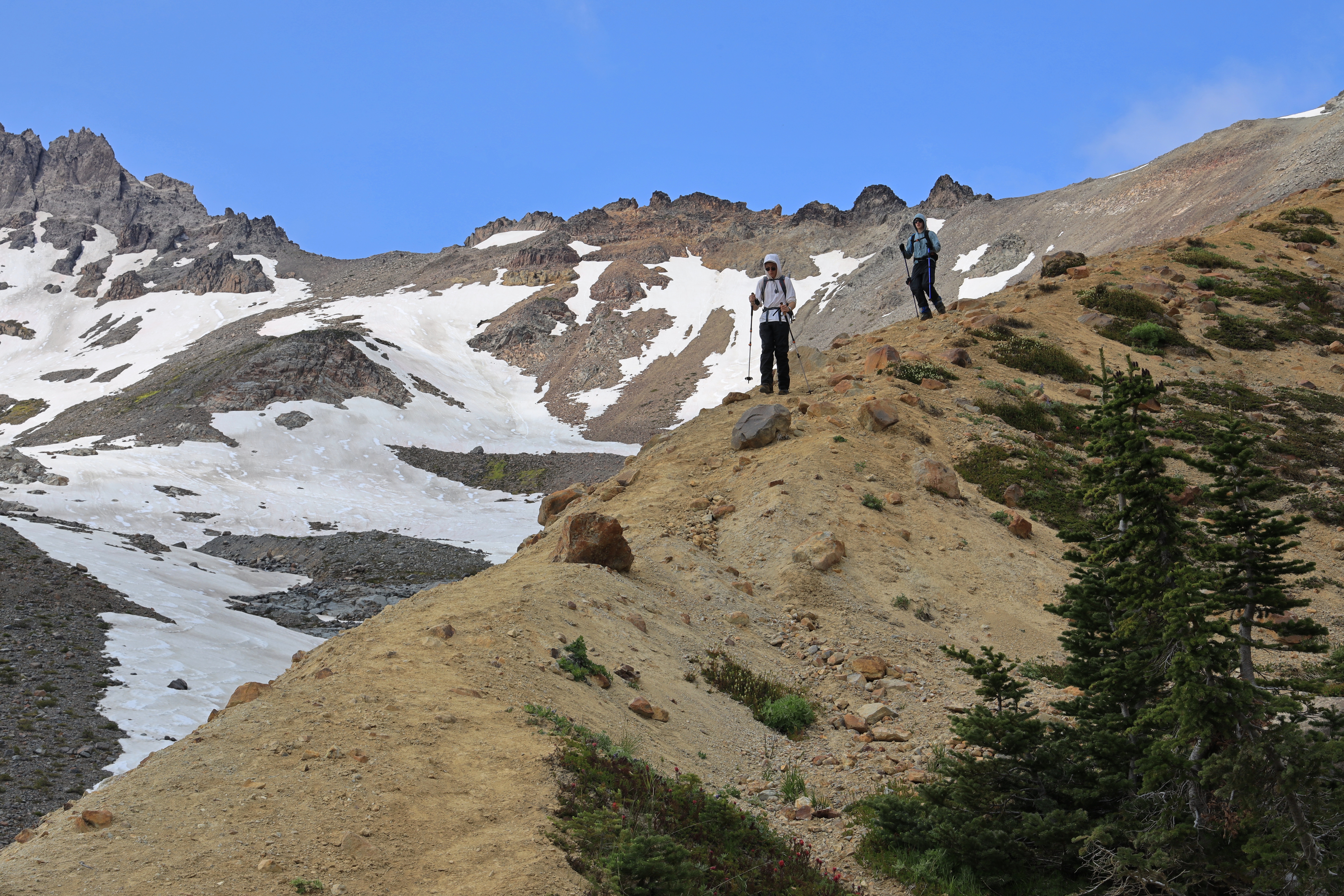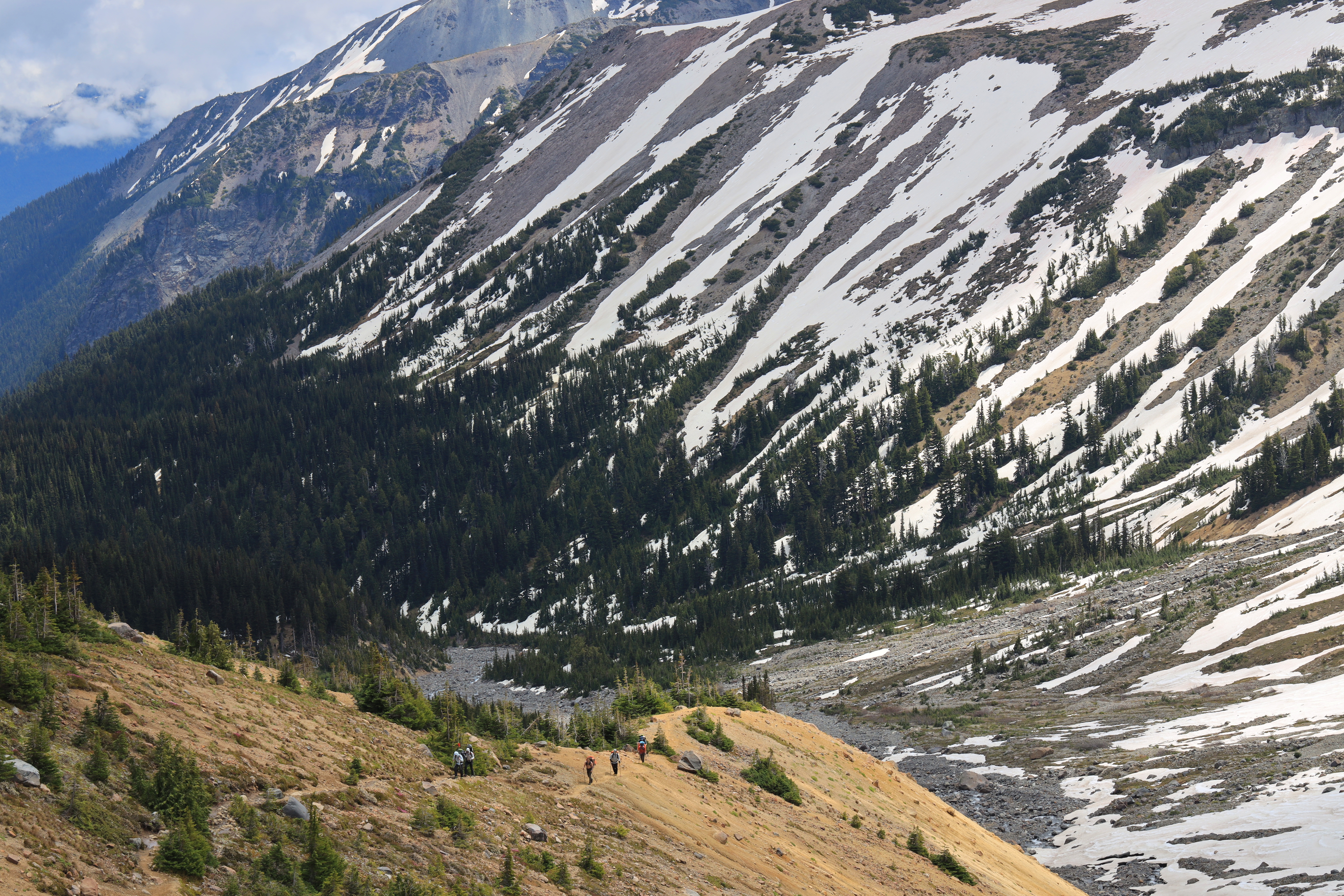 캠프 (Glacier Basin Camp)에서 보는 전경입니다. 앞쪽 등반객은 눈산에 오를 준비를 하고 있습니다. 캠프까지는 등산로 상태가 매우 좋지만, 이 위로는 관리되지 않는 등산로라서 약간 험하고 가파릅니다.