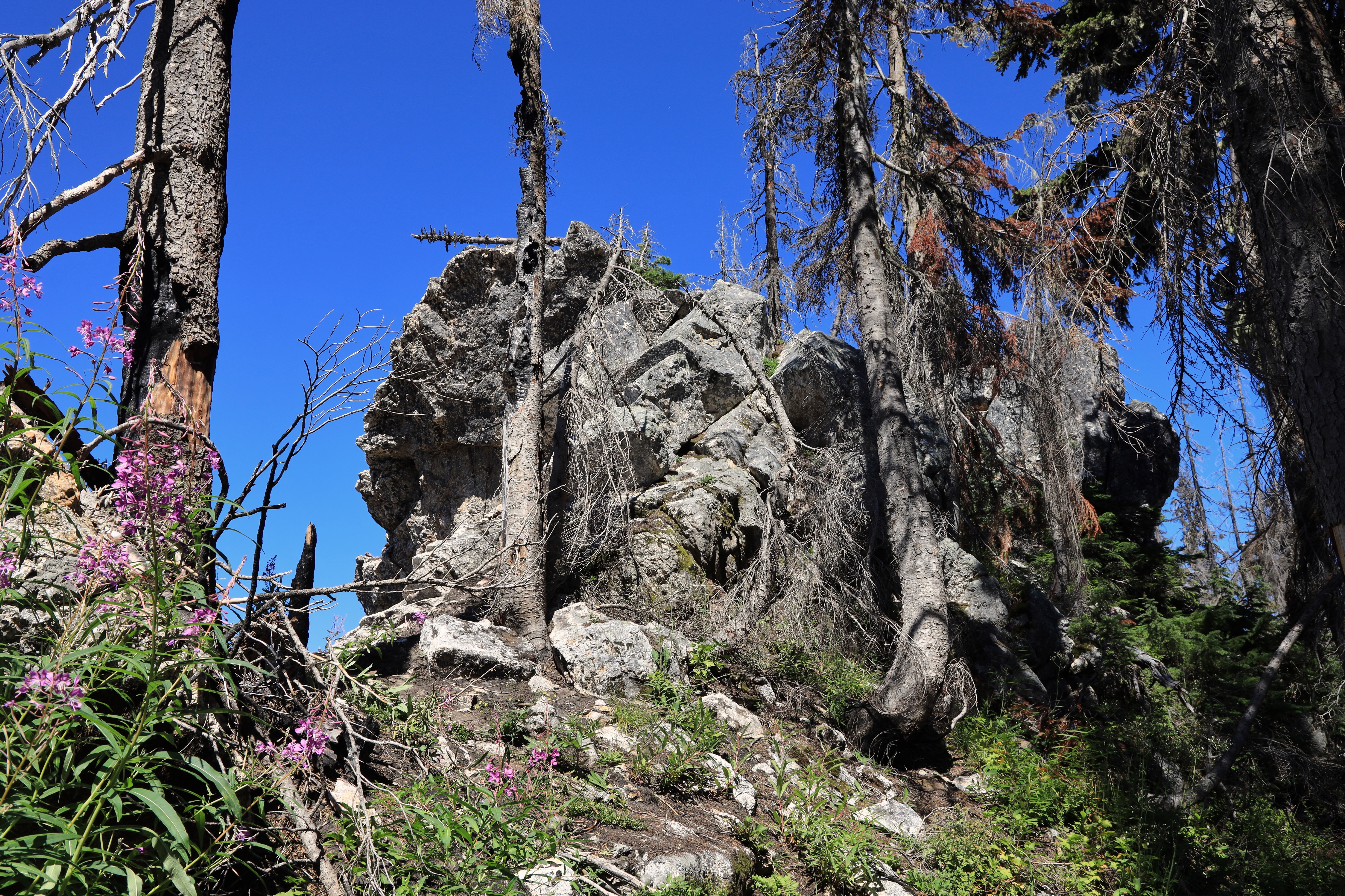 시인 릿지 (Poet Ridge)로 올라 Poe Mountain 가는 길입니다. 능선을 따라가며 전망이 계속 바뀌고 야생화가 피어있어 흥미로운 곳이지만, 안타깝게도 최근 산불흔적이 선명하게 남아있습니다. 산불잔해는 대부분 정리되어 산행에 큰 불편은 없었습니다.