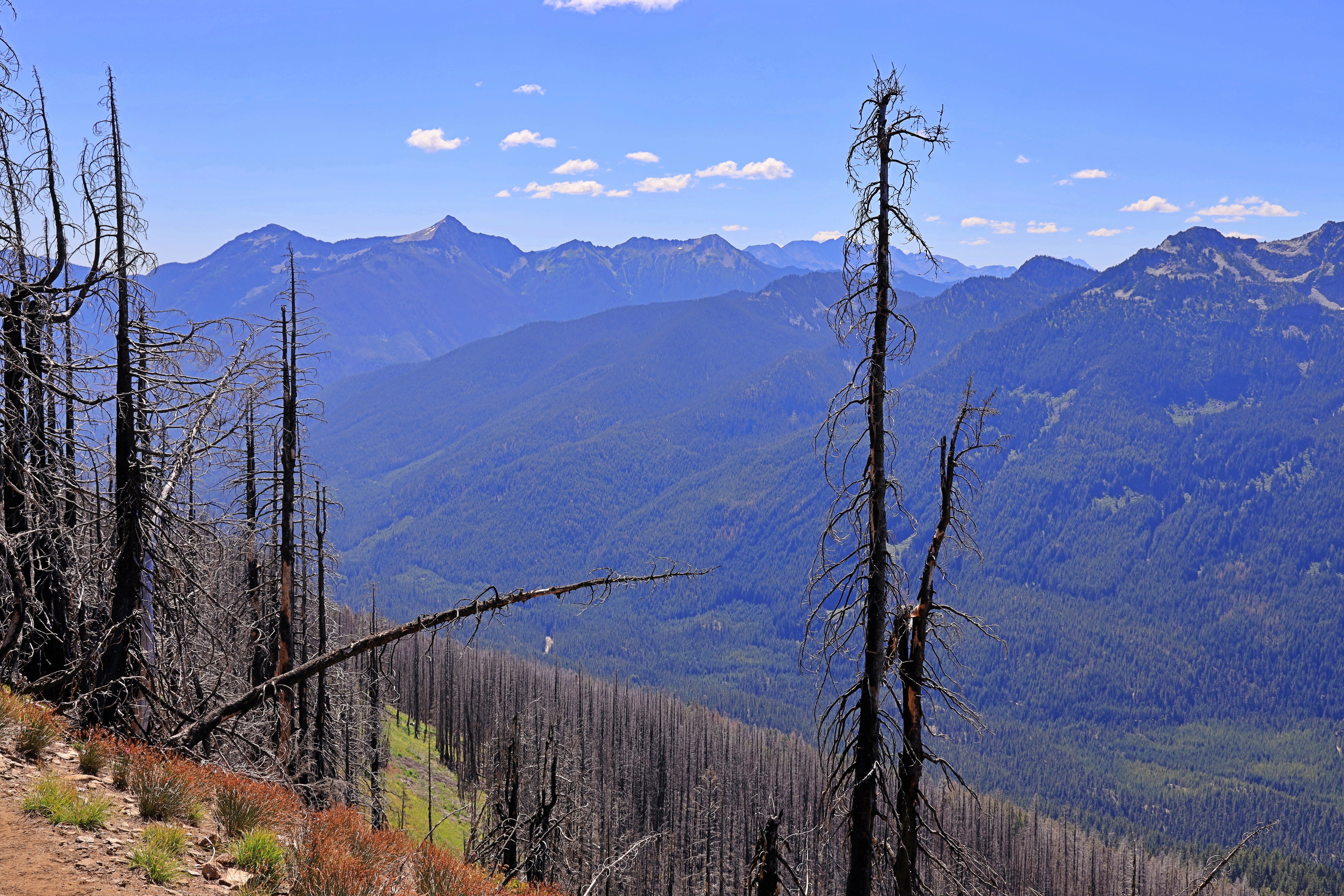 산을 오르며 왼쪽으로 보이는 전망입니다. 옅은 산불연기가 깔려있어 시야가 흐릿합니다. 그나마 바람방향이 Chelan 지역과 반대라서 산불연기가 심하지는 않았습니다.