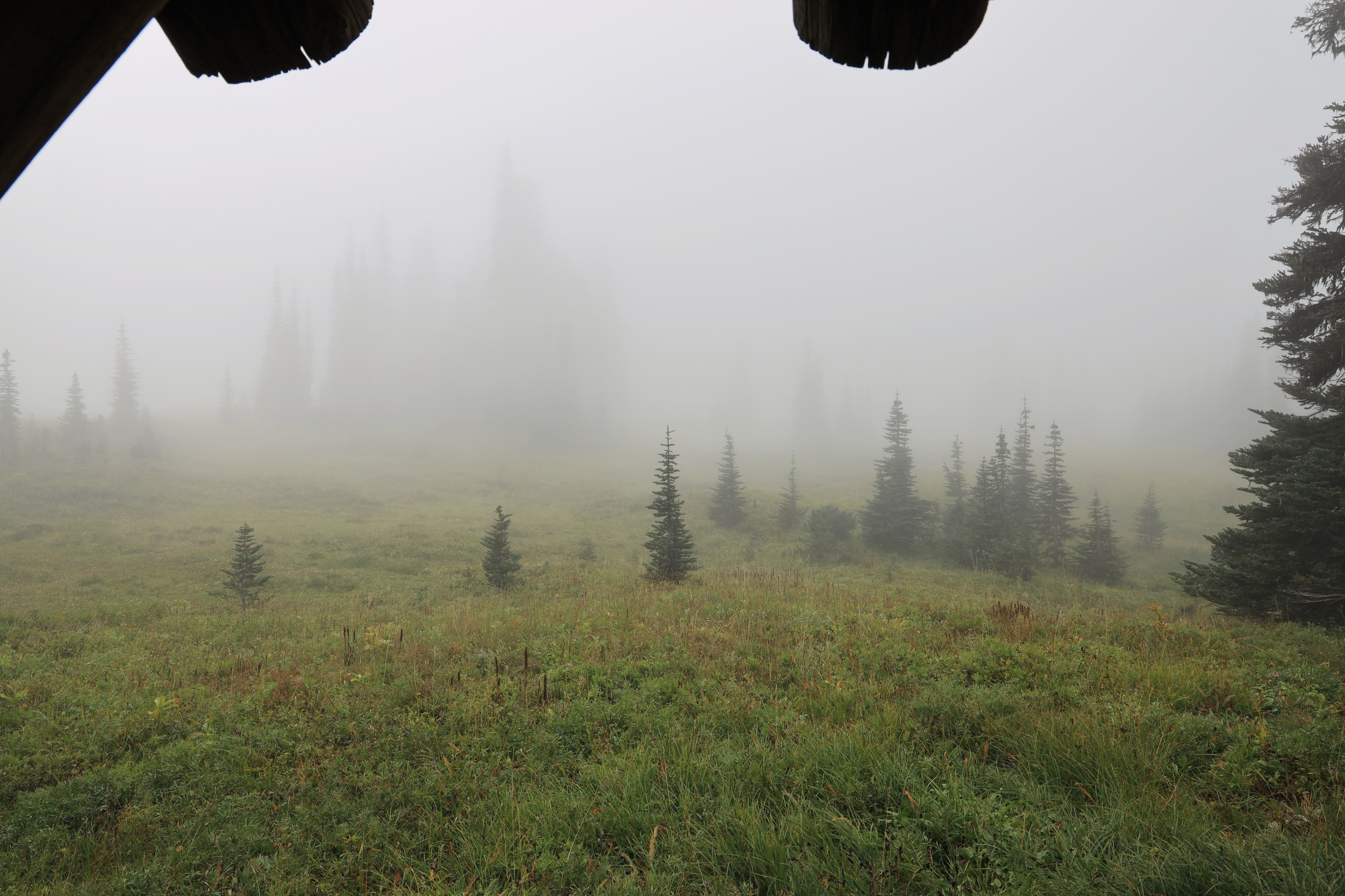 등산로는 구름에 덮여 시야가 좋지 않았습니다. 눈산에 걸린 구름이 바람 한점 없어 꼼짝 하지 않는 것 같습니다. 중간 전망지점에서도 구름만 보입니다.