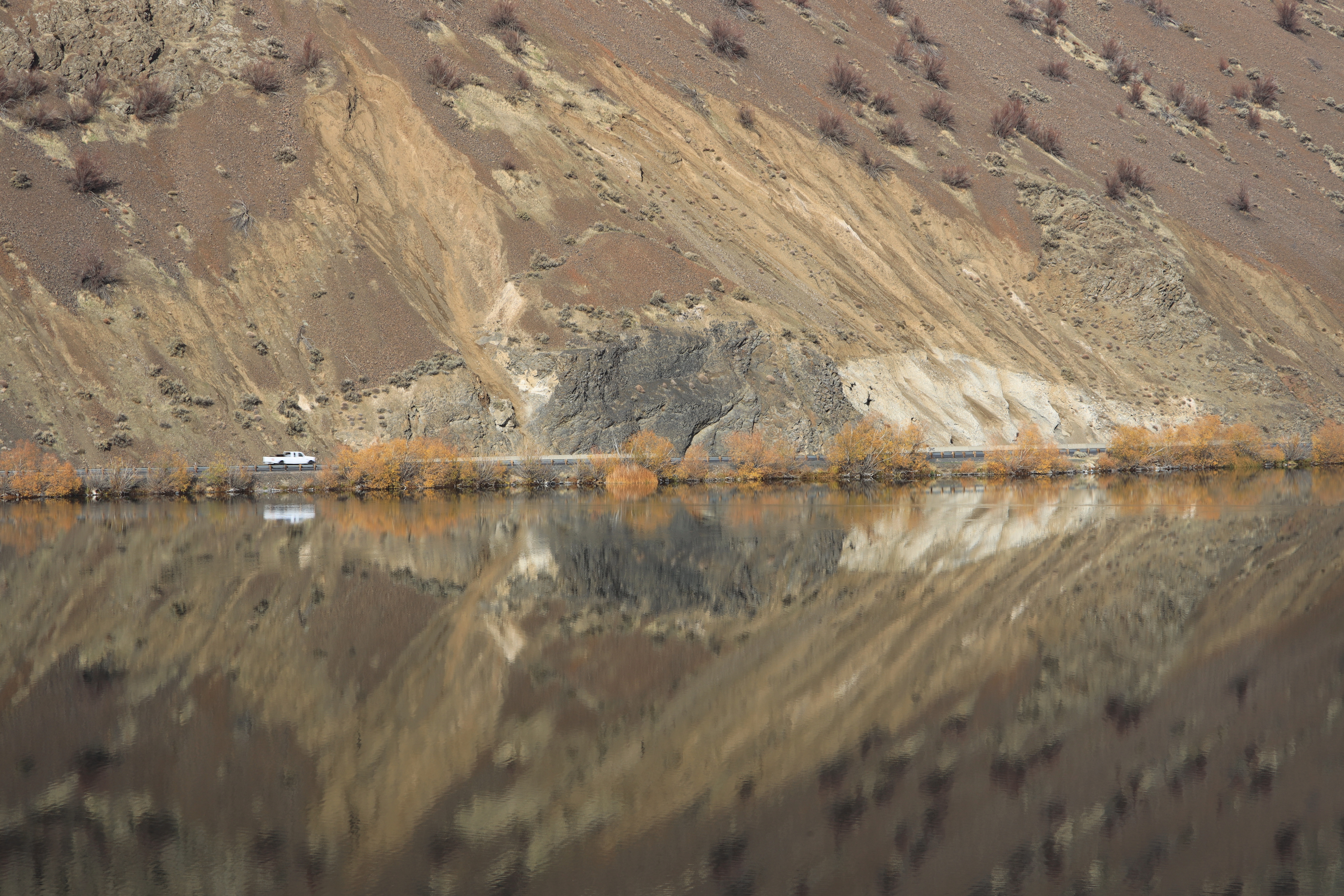 호수 건너편 도로를 지나는 차가 보입니다. 이 도로 (17번, Dry Falls Junction에서 Soap Lake까지)를 따라 이어지는 빙하시대 만들어진 협곡은, 단지 운전만 해도 '인생 드라이브'가 될 것입니다.