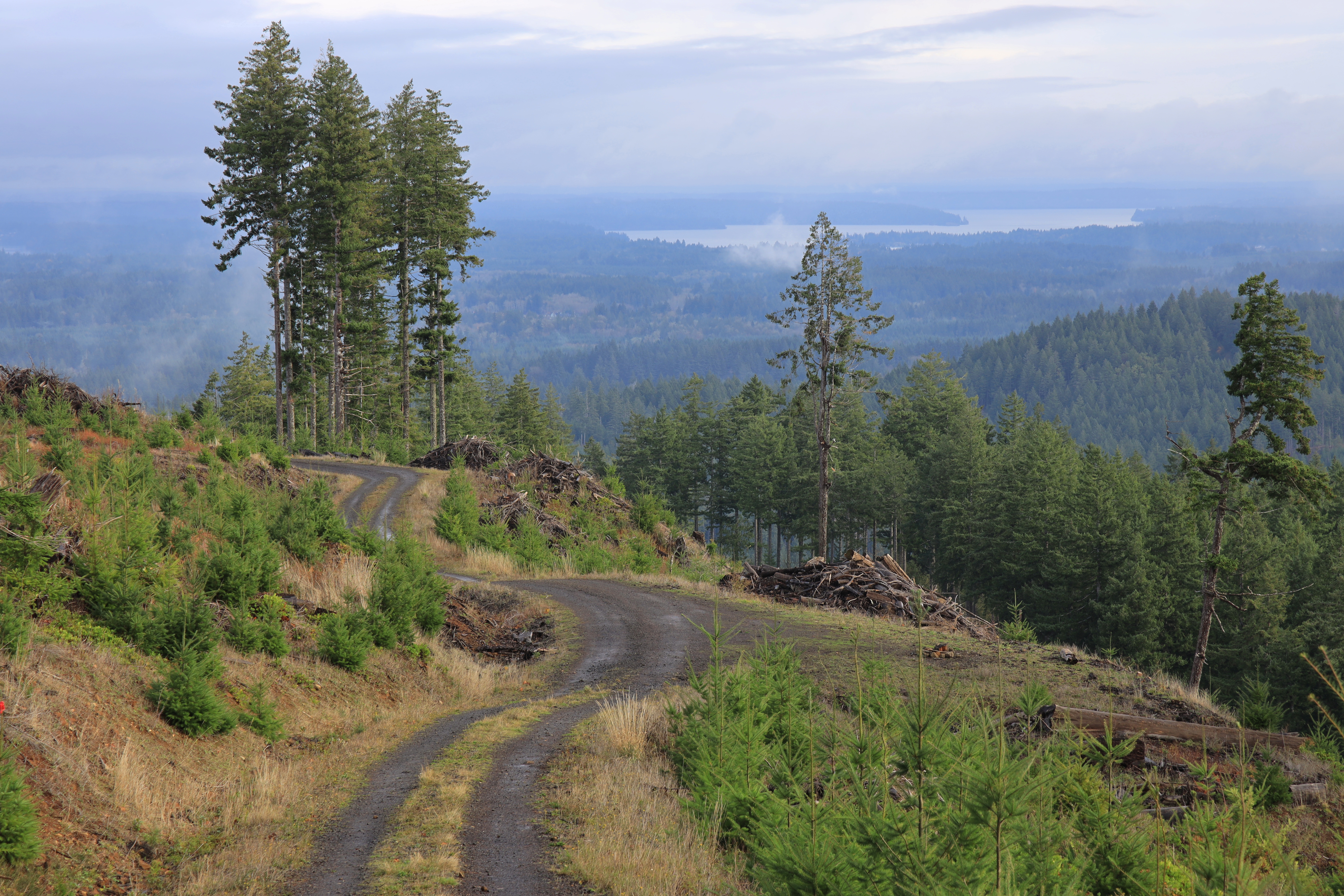 자갈이 깔려있는 산악도로를 걸어서 오릅니다. 지난밤에 비가 많이 왔는데도 진창이 된 곳이 없었습니다. 궂은날 올라도 좋겠습니다. 산새소리조차 들리지 않는 적막한 등산로를 오르면 산 위에는 벌목을 하여 사방으로 바다 물길이 보입니다.