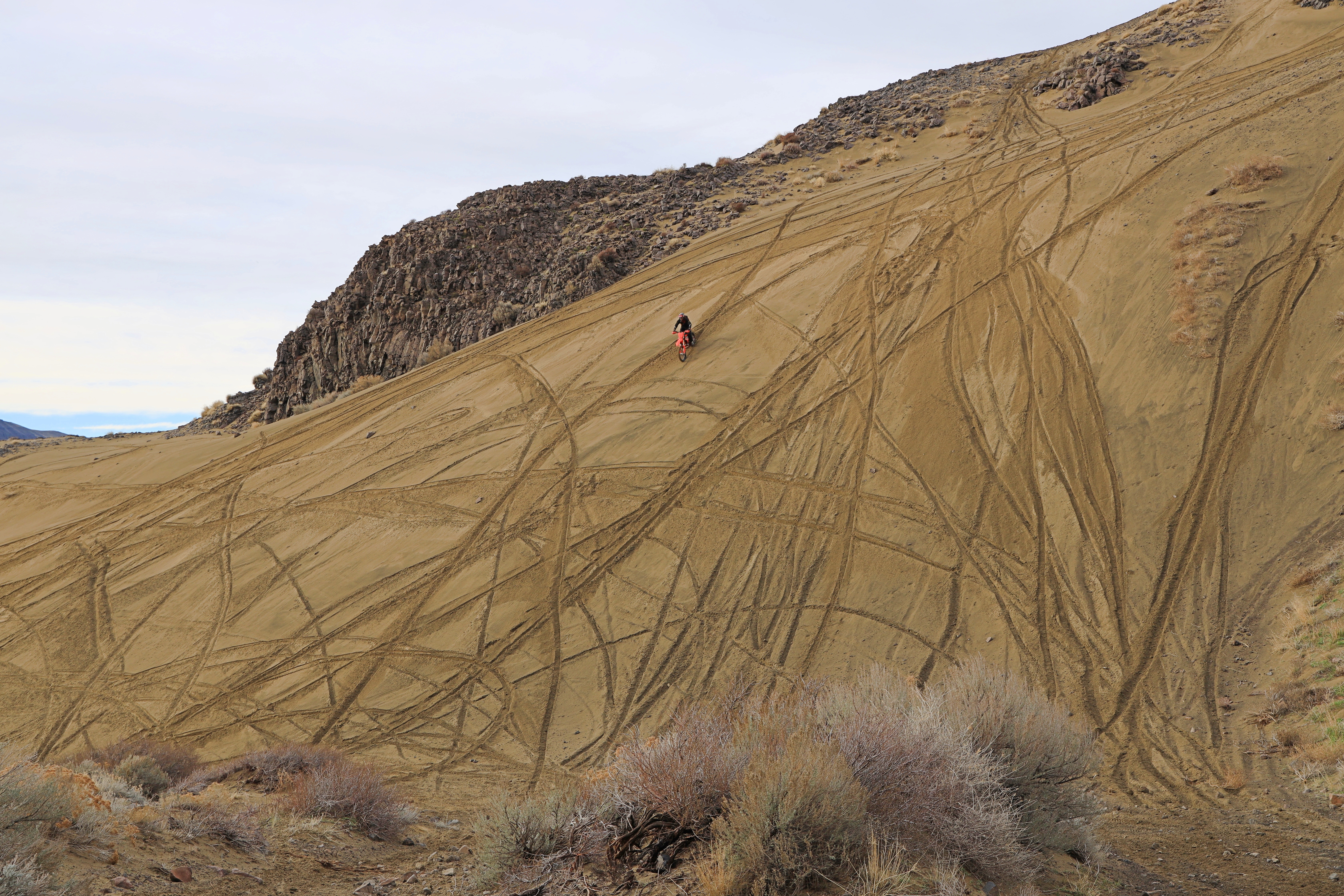 급경사 모래산에 산악오토바이 바퀴자국이 있습니다. 너무 급경사라서 이게 웬일인가 싶었습니다.