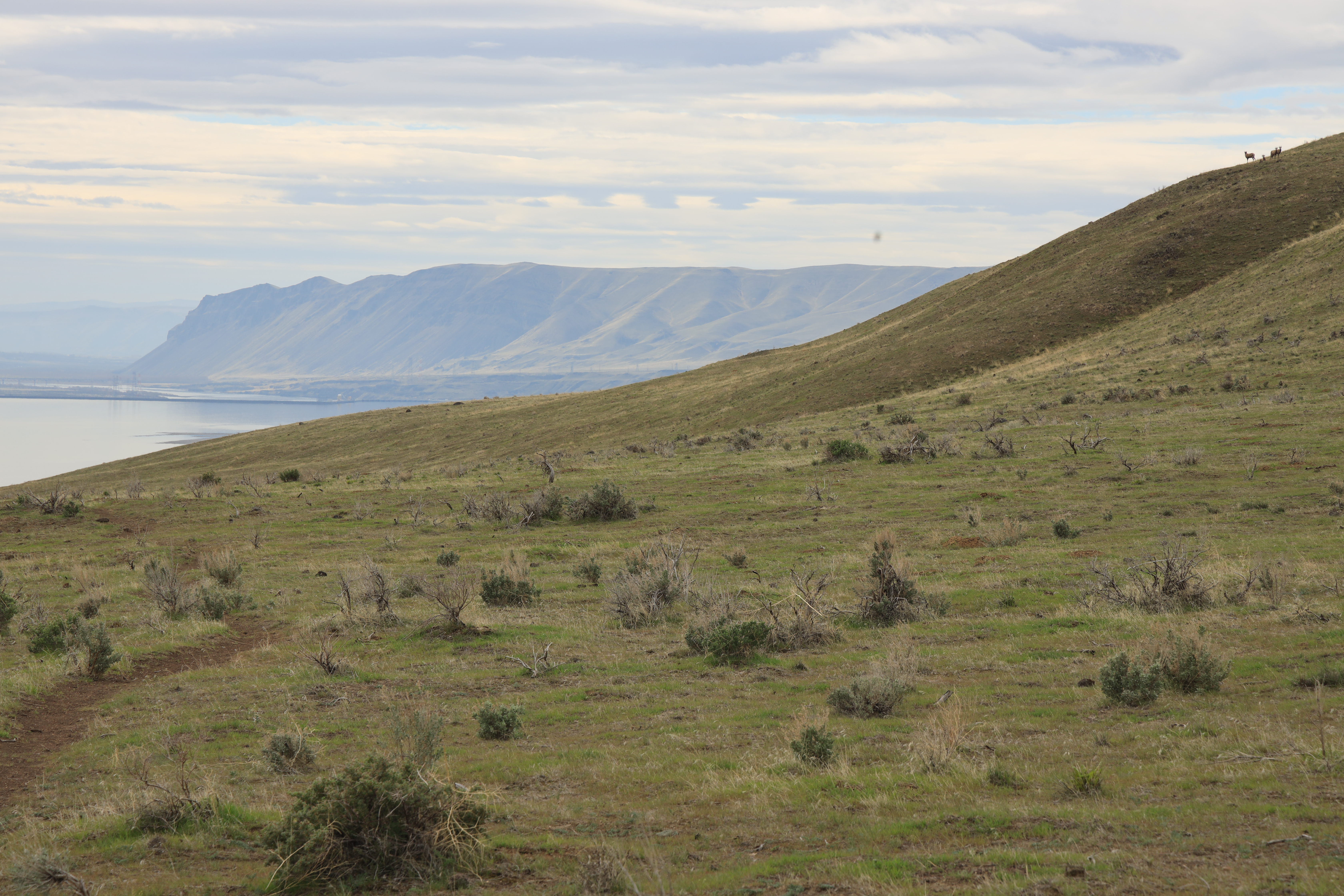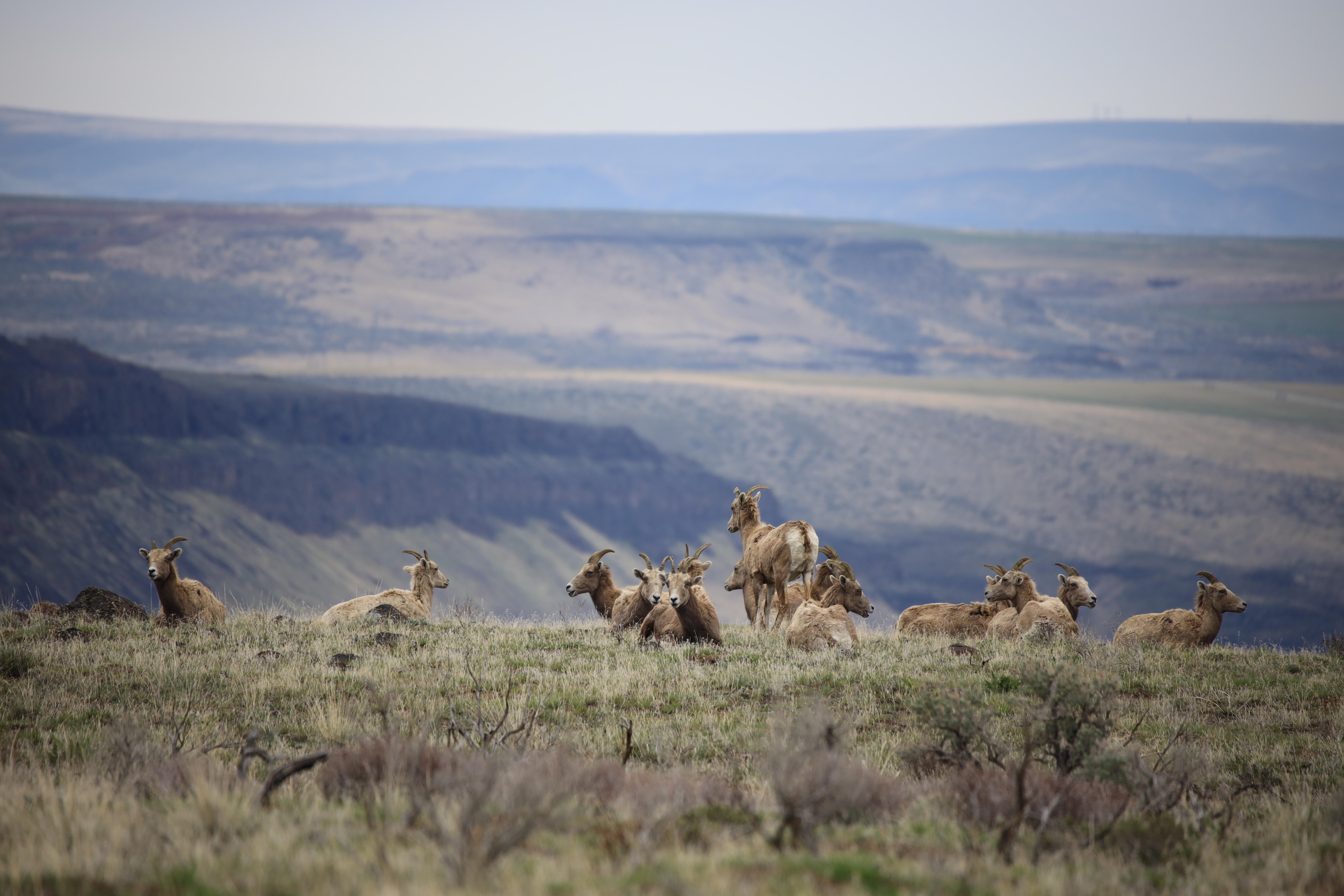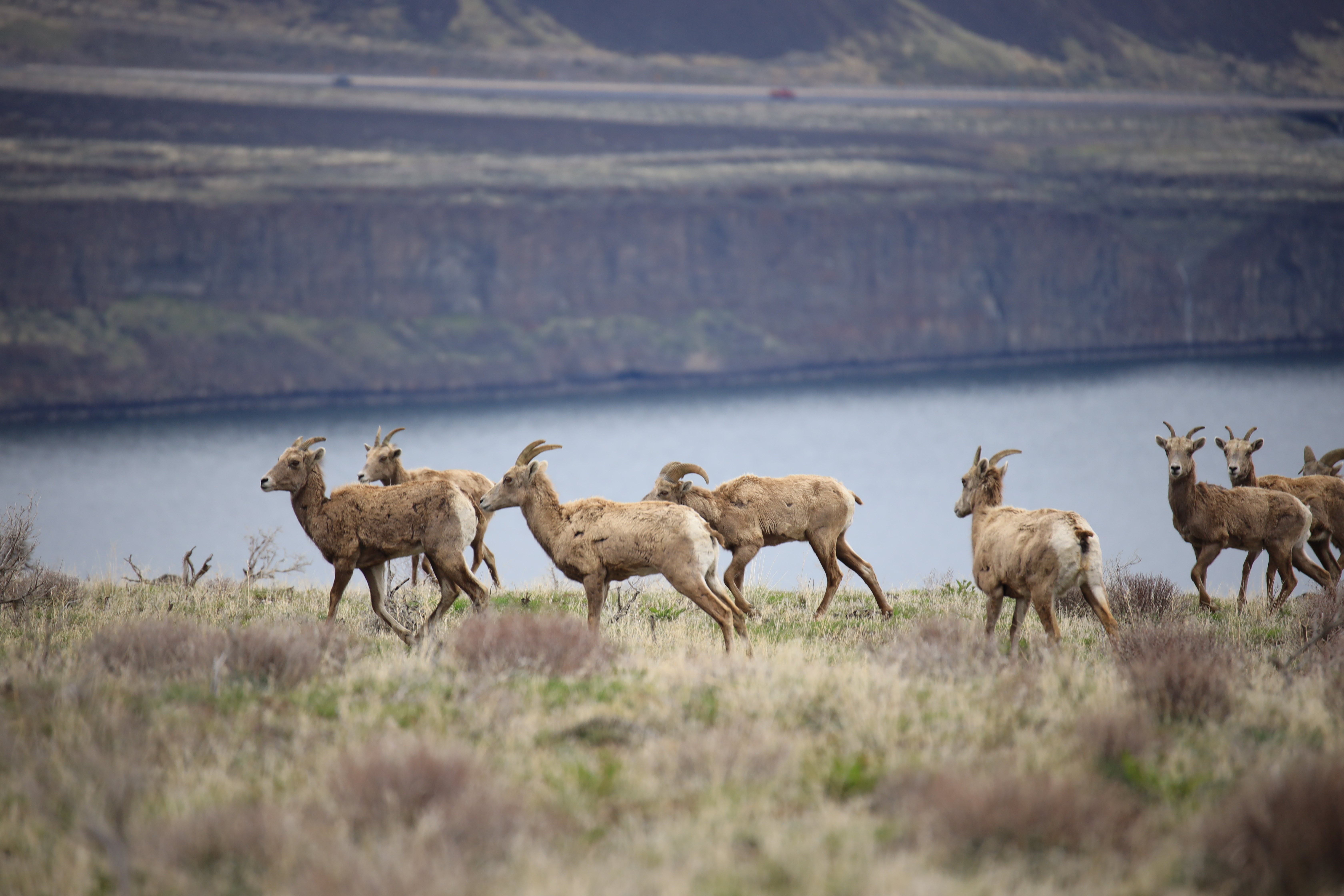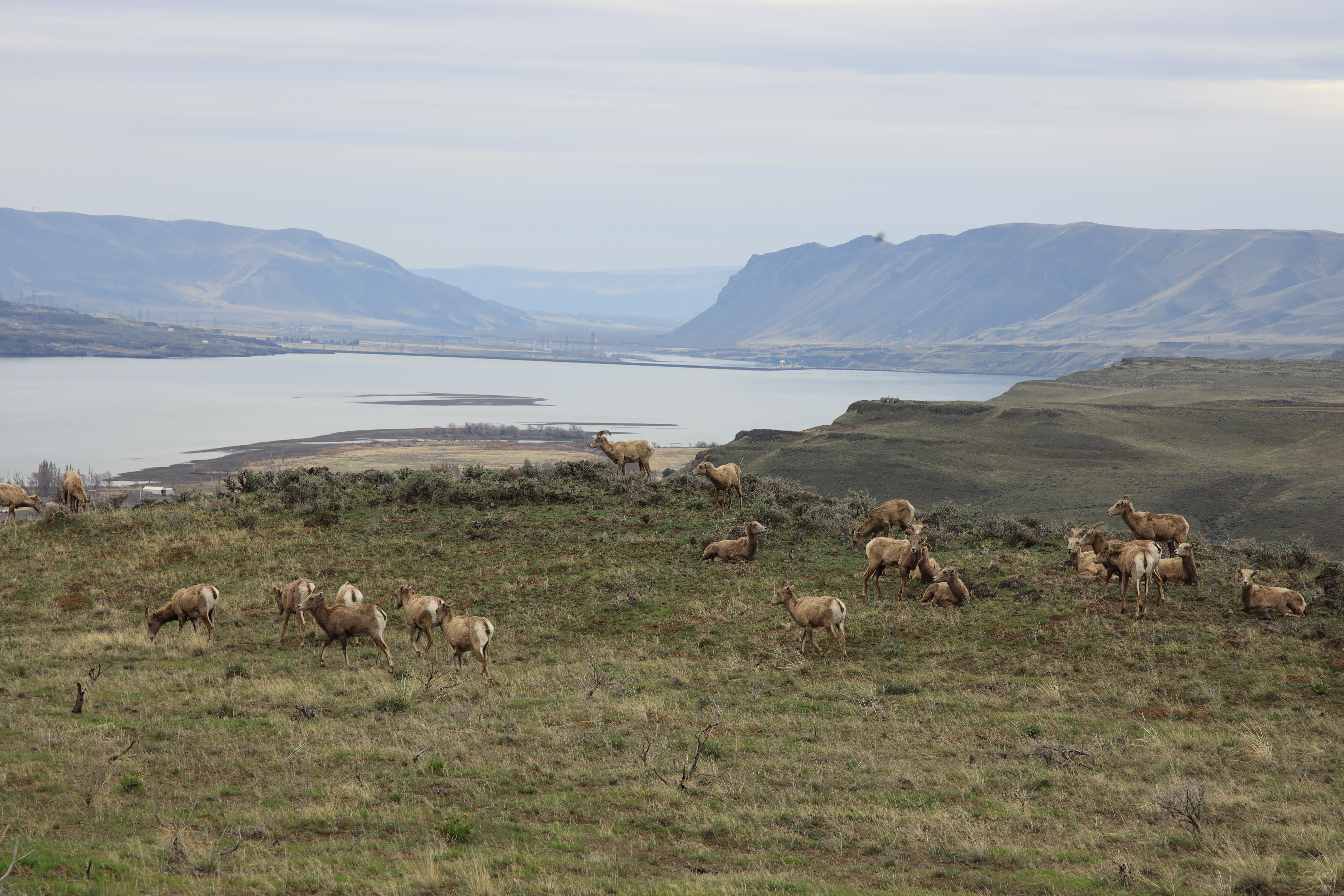 큰뿔 양 (Bighorn Sheep) 같습니다. 한 무리 40여 마리가 언덕 위에 앉아 있었는데, 컬럼비아 강 전경을 담으려다 우연히 발견했습니다.