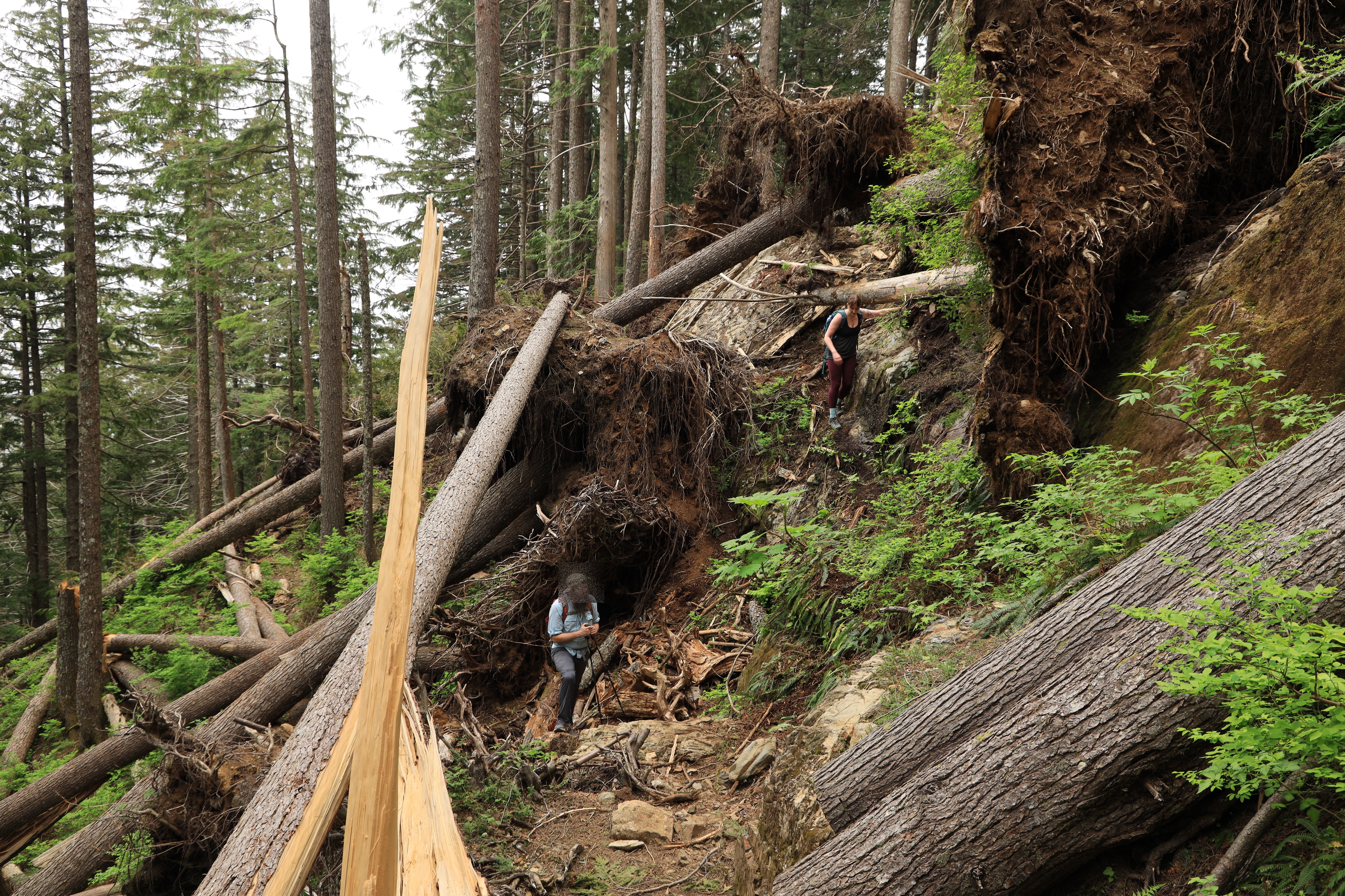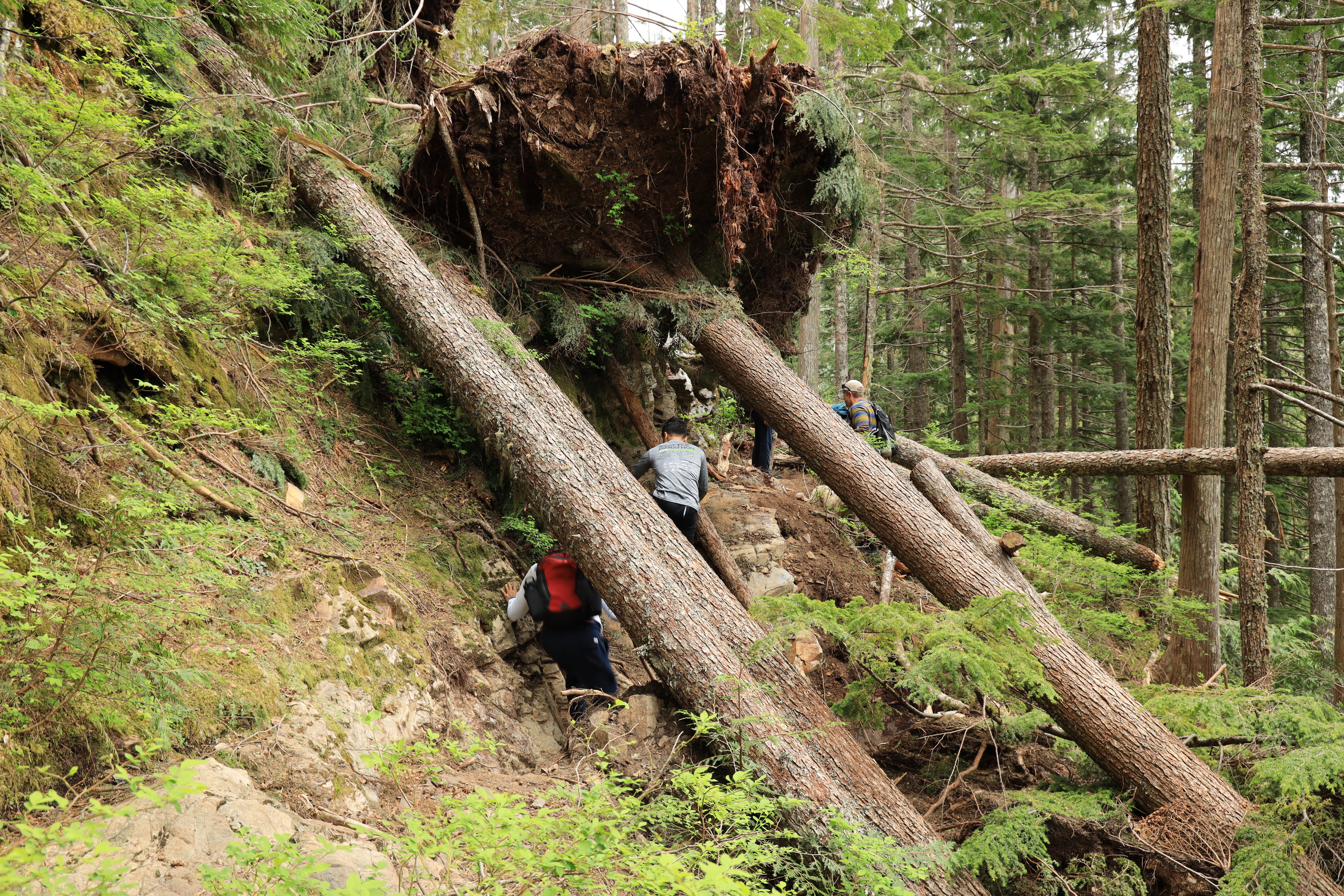 몰빵 쳐서 오르는 급경사 지역에는 나무들이 쓰러지며 등산로도 같이 무너졌습니다. 산비탈이 급경사라서 돌아갈 수도 없고, 쓰러진 나무 아래, 위 그리고 사이로 재주껏 통과합니다. 그리고, 평지 지역은 계곡의 외나무다리가 망가져 살금살금 계곡을 건넜습니다. 지금 새 다리를 공사 중입니다.